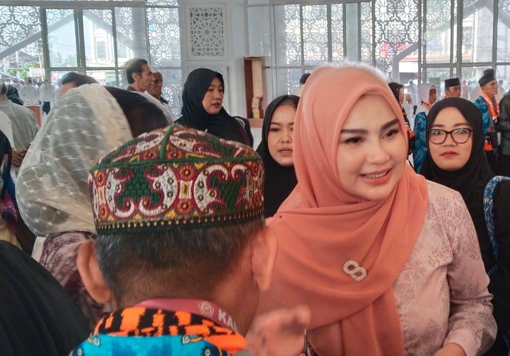 Ketua TP PKK Melawi, Raisya Sarbina, saat menyerahkan bingkisan kepada seluruh CJH dalam rangkaian pelepasan CJH Melawi 2025 di Masjid Juang Kota Nanga Pinoh