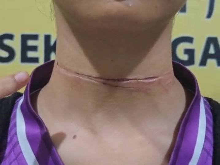 Terlihat jelas bekas luka di leher korban seorang wanita bernama Devi Lestari akibat tergores tali layangan di Jembatan Melawi 1