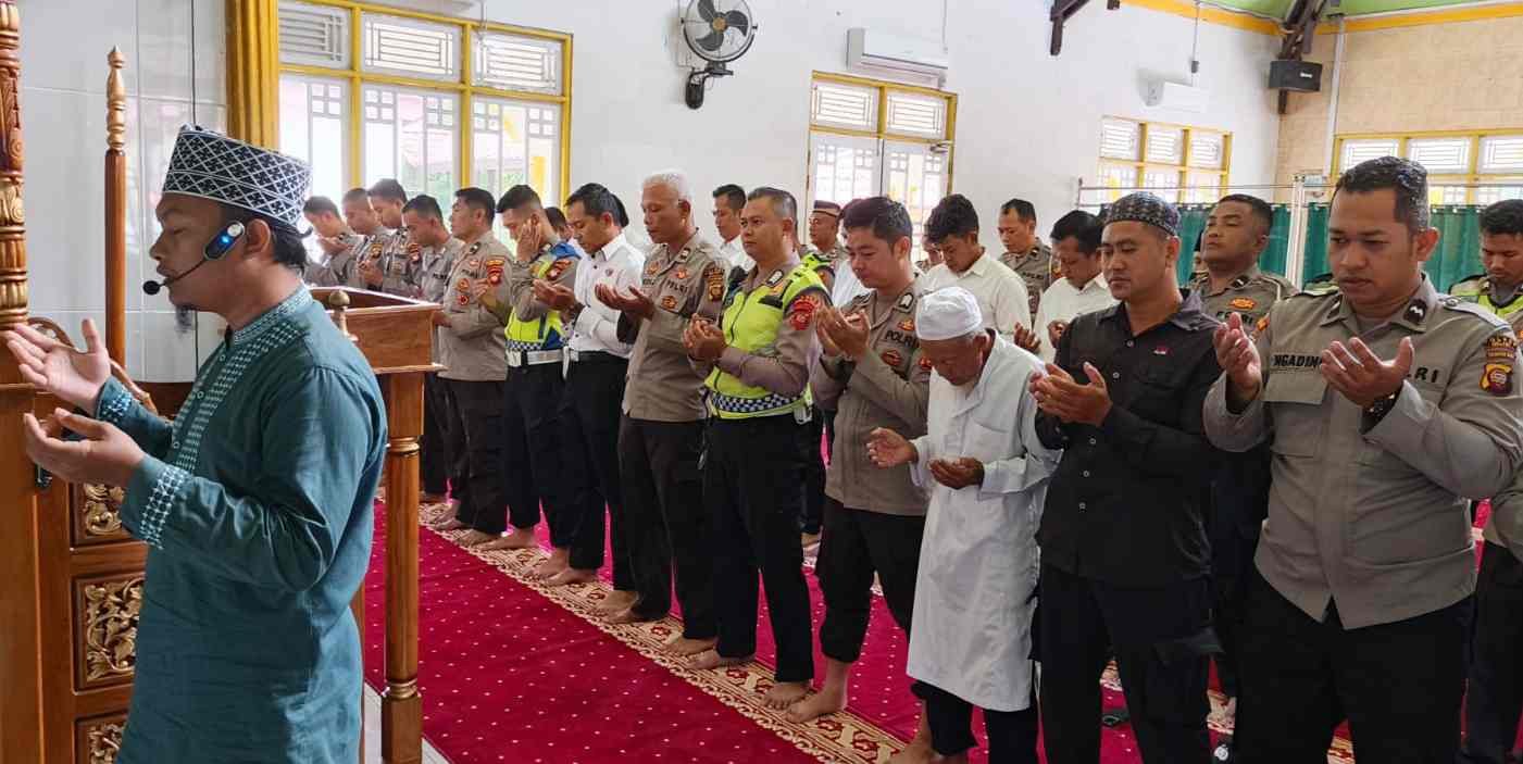 Personel dan ASN beragama Islam mengikuti doa bersama dan sholat gaib di Masjid Shirotul Jannah Polres Melawi, sementara personel Nasrani melaksanakan doa bersama di Aula Tribrata Polres Melawi.